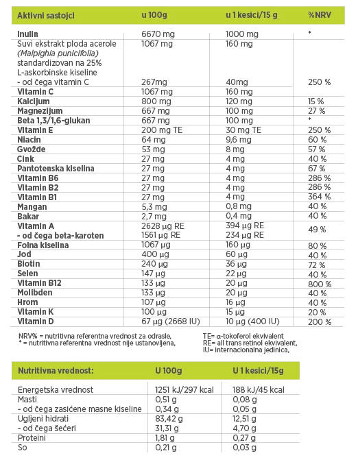 - Sadrži 27 nutrijenata – 14 vitamina, 10 minerala, i 3 moćna sastojka beta-1,3/1,6-glukan, vitamin C, suvi ekstrakt ploda acerole (Malpighia punicifolia) i inulin.